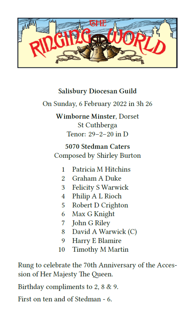 Following the visit of the Mayor of Wimborne and the Deputy Lord Lieutenant of Dorset to the Parish Eucharist in the morning, a peal of 5070 changes of Stedman Caters was successfully rung on the Minster Bells during the afternoon to celebrate the 70th anniversary of Her Majesty The Queen’s Accession to the throne. The intended peal of Stedman Cinques was sunk at the final moment by two members of the band contracting Covid, but the peal sounded as the bells would have been heard 70 years ago to a composition specially composed for a Platinum Anniversary.