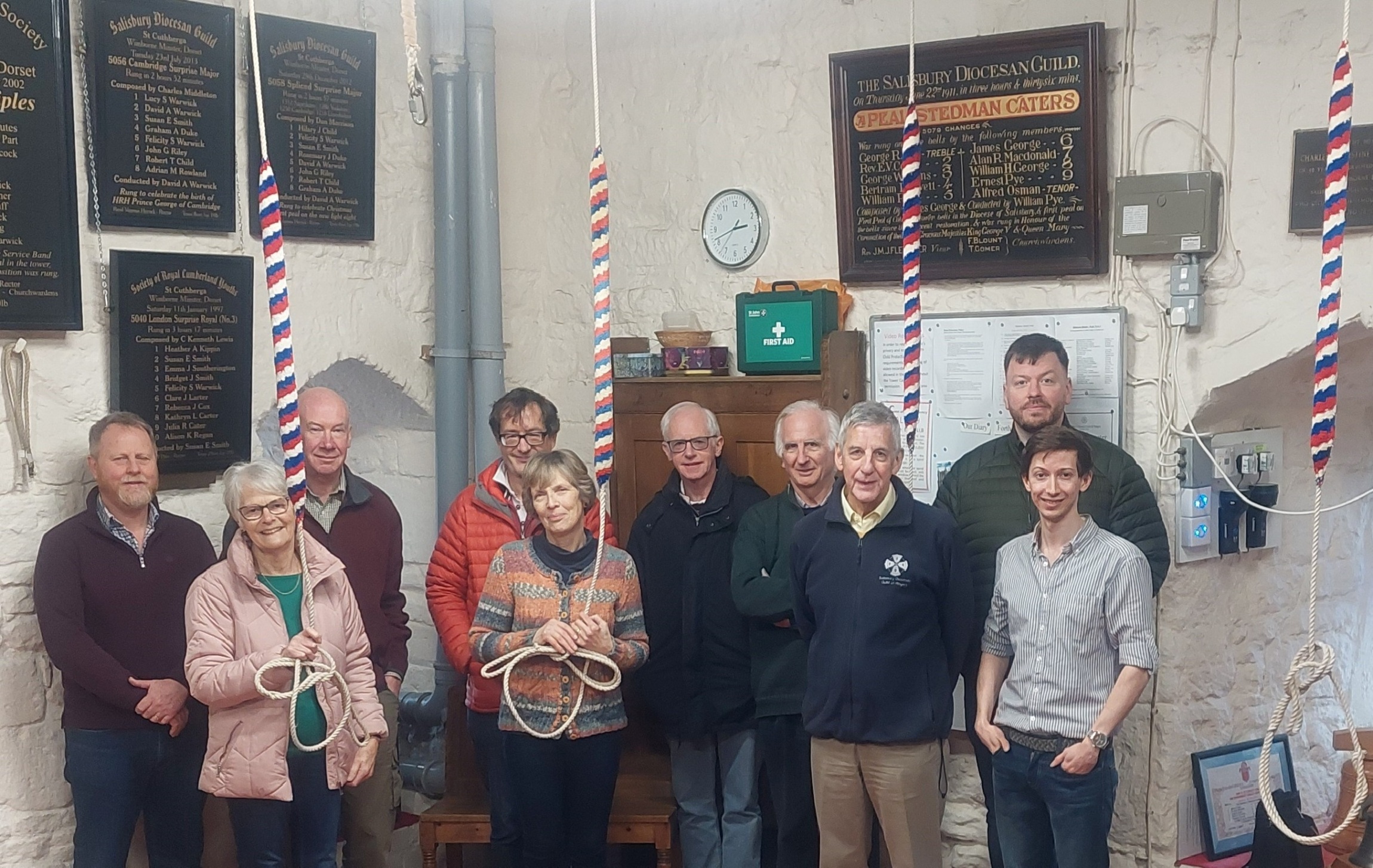 Following the visit of the Mayor of Wimborne and the Deputy Lord Lieutenant of Dorset to the Parish Eucharist in the morning, a peal of 5070 changes of Stedman Caters was successfully rung on the Minster Bells during the afternoon to celebrate the 70th anniversary of Her Majesty The Queen’s Accession to the throne. The intended peal of Stedman Cinques was sunk at the final moment by two members of the band contracting Covid, but the peal sounded as the bells would have been heard 70 years ago to a composition specially composed for a Platinum Anniversary.