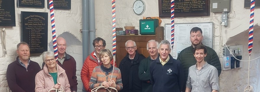 Photo of Peal Band l-r: Tim Martin, Trish Hitchins, Philip Rioch, David Warwick, Flick Warwick, Bob Crighton, John Riley, Ben Duke, Harry Blamire, Max Knight