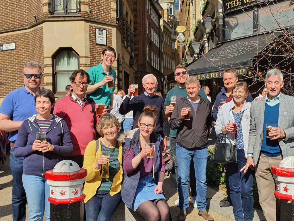 The Wimborne Team enjoy a drink after ringing in the National 12-bell Competition Eliminators in London March 26th 2022