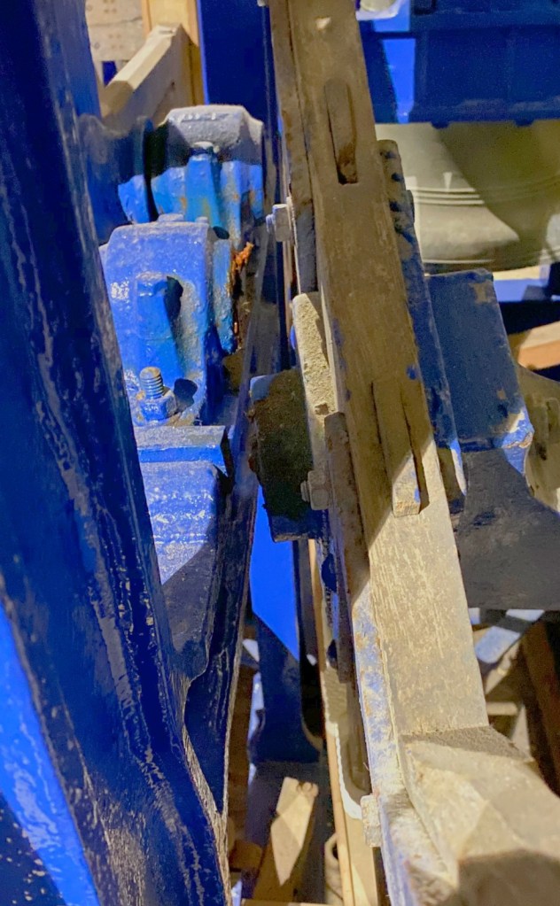 The diagram shows that the bell’s “gudgeon” is equivalent to the axle on a wheel, so a break here puts the bell out of action and, due to the weight of the bell, at 350kg equivalent to a large touring motorbike, puts a strain on the surrounding components.