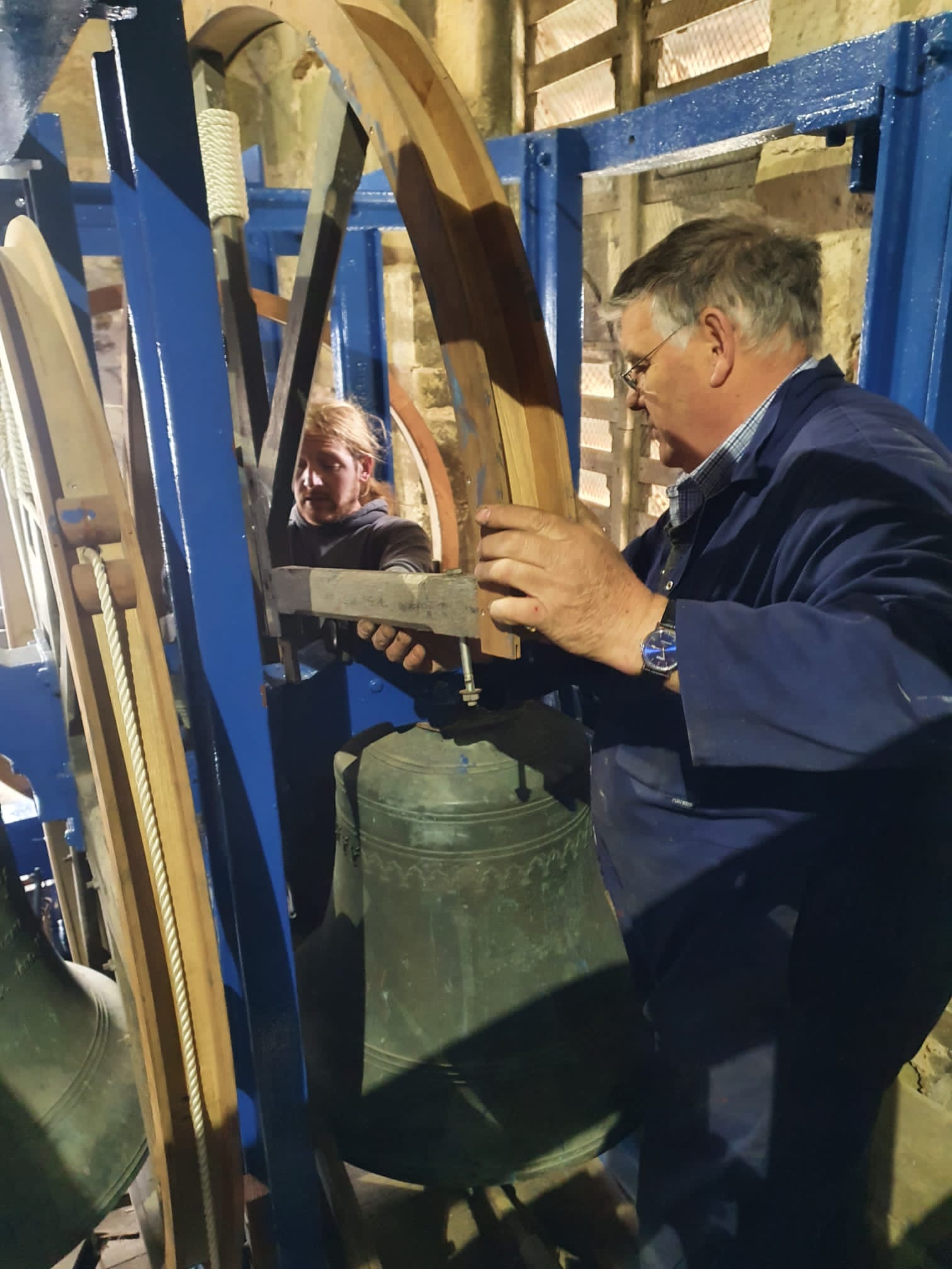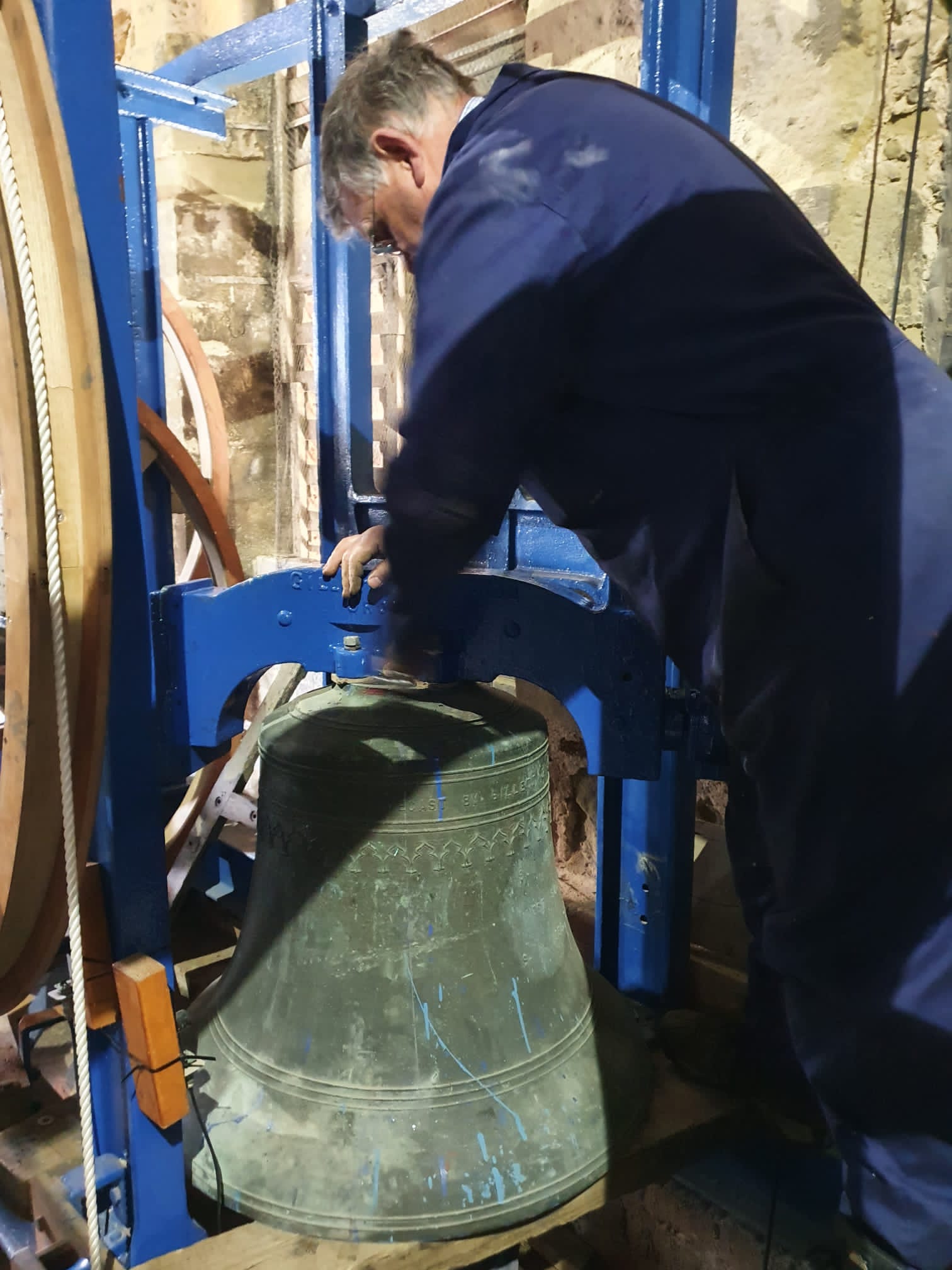 Not only was it unringable, but the bell was teetering in an unstable position, so a team of the ringers led by Rob Child, the Steeple Keeper, worked carefully to secure the bell in place using ropes, prior to a bell hanger from White’s of Appleton being called in to inspect and advise.
