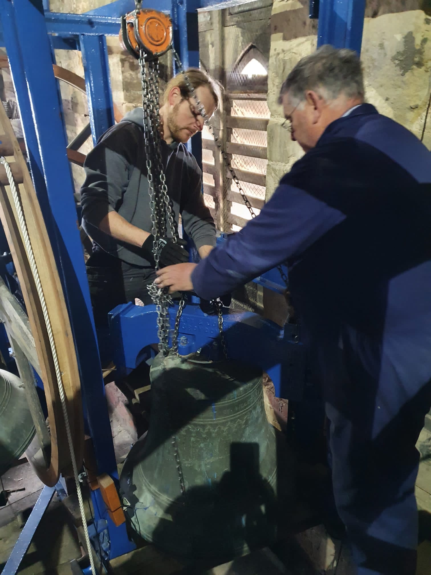 The photos show the process of re-installation of the bell, by Whites of Oxford, assisted by the Minster Steeplekeeping team.